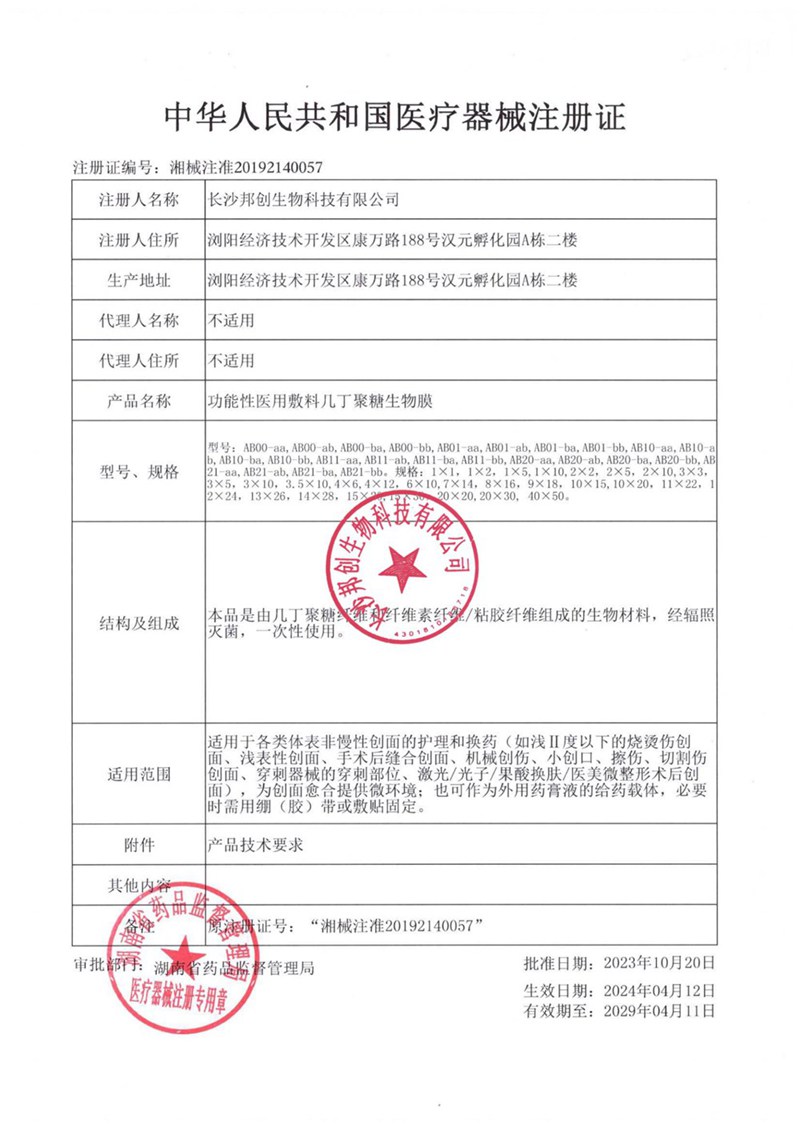 功能性醫(yī)用敷料幾丁聚糖生物膜注冊證